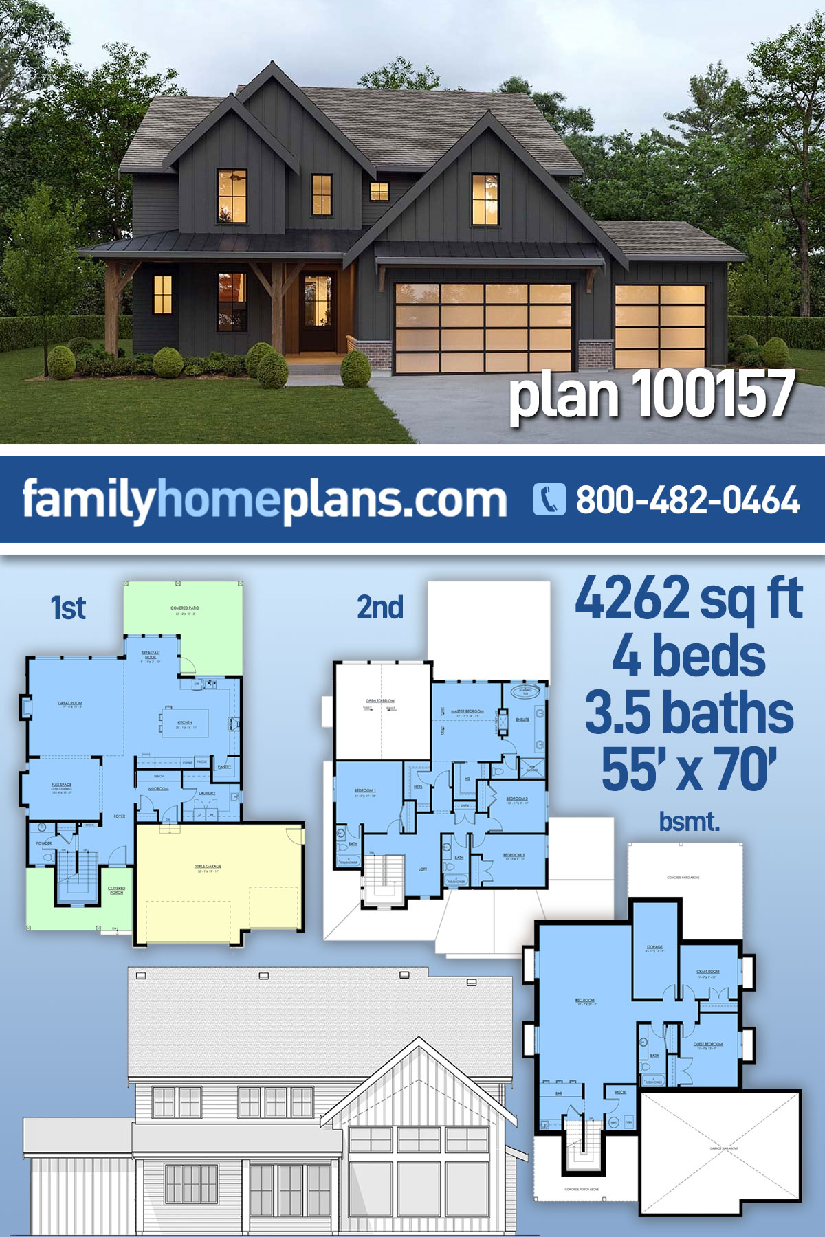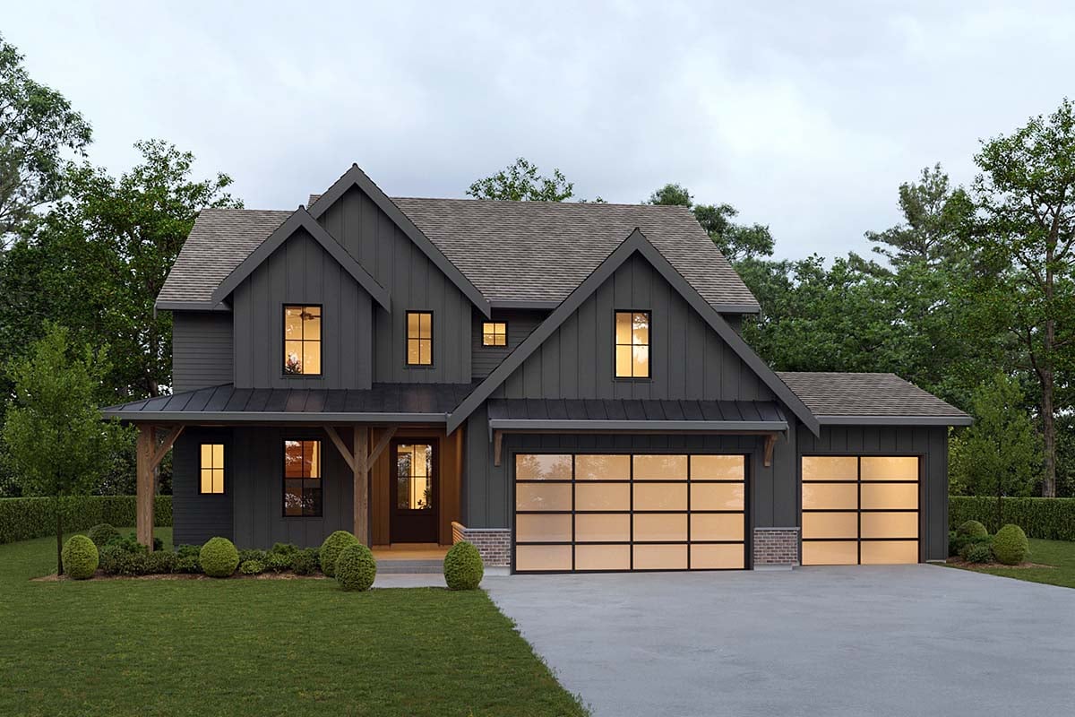 Choose dark and moody siding to create the look of this Modern Farmhouse Plan. The triple garage opens into a nice mudroom with coat closet and bench seating. Next, the large laundry room offers a utility sink and lots of counter space. Prepare meals in the expansive kitchen and spread out on the island. Living space is expanded with a flex space on this level as well. Included in this 4,262 sq ft, 4 bedroom, 3.5 bathroom plan, all 4 bedrooms are upstairs including a luxury-sized master suite.