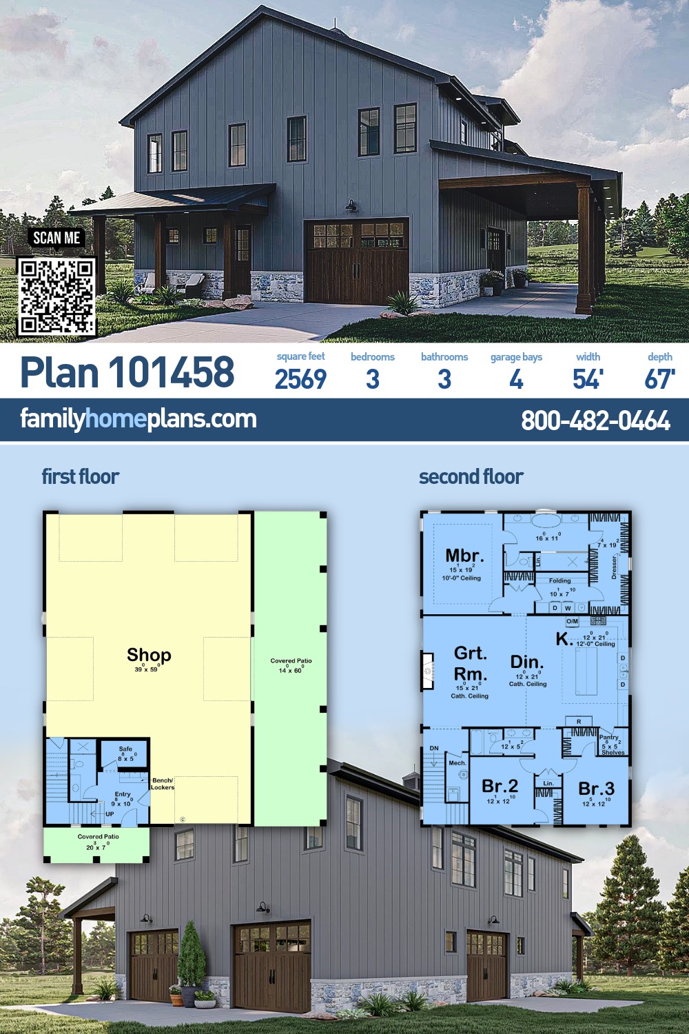 Plan 101458 | Barndominium, Country Garage-Living with 3 Bed, 3 Bath, 4 Car