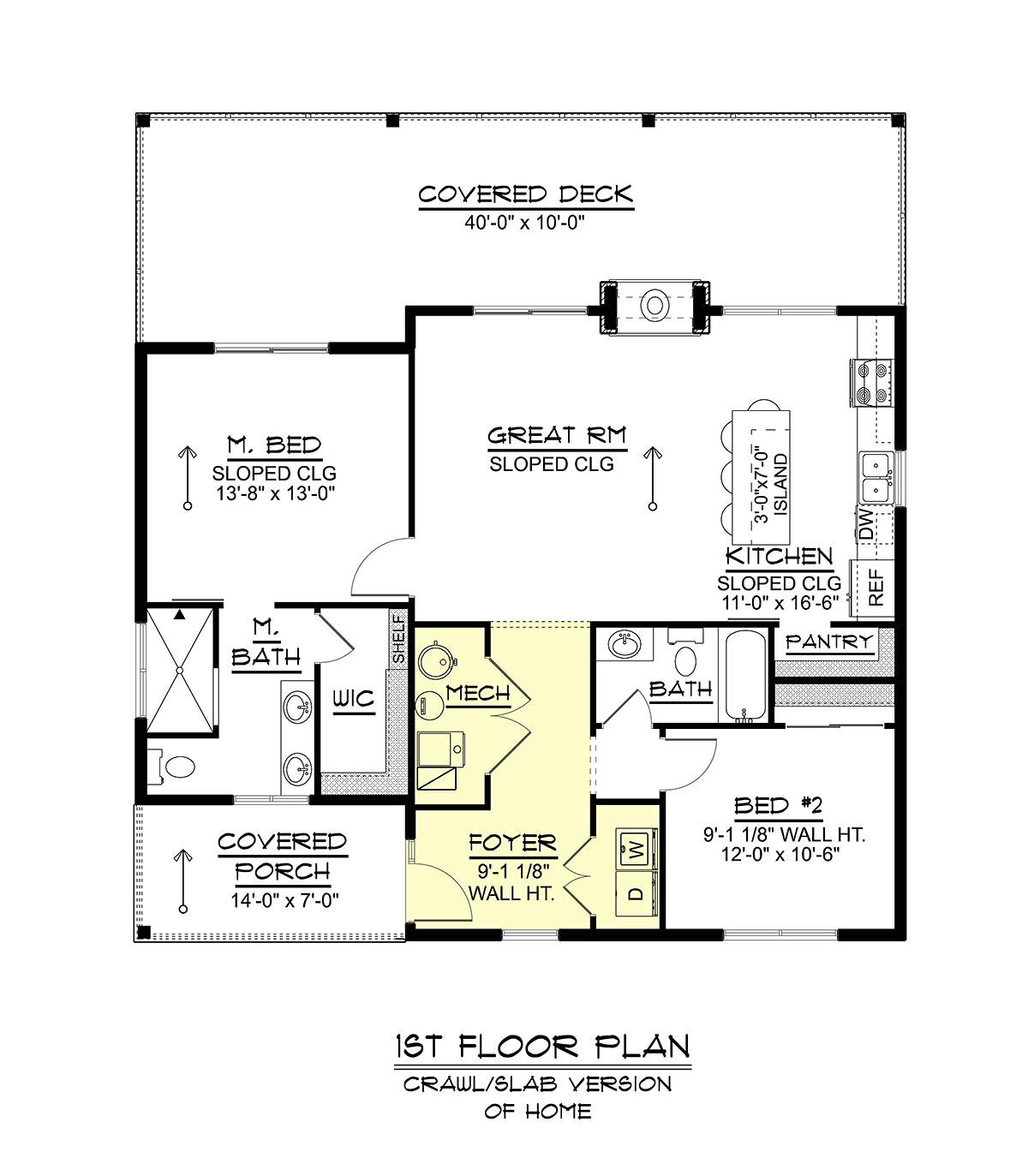 The open-concept great room and kitchen layout provides a spacious central living area with tall sloped ceilings and access to a generous 10’-deep covered deck. The deck connects directly to both the great room and the rear-facing primary suite, making it perfect for outdoor entertaining or quiet moments with a view.