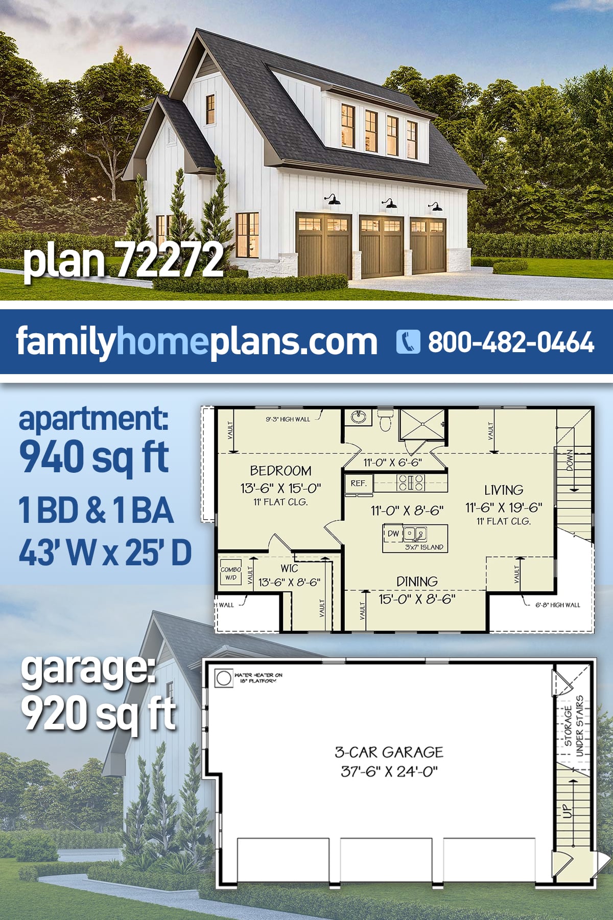The 3 Car Garage Apartment Plan With One Bedroom (Plan 72272) delivers 940 sq. ft. of efficient living space with 1 bedroom and 1 bathroom, ideal for guests, rental income, or a private retreat. The exterior stands out with crisp vertical white siding and a charming doghouse dormer above the garage. The main level consists of a spacious 920 sq. ft. three-car garage with interior access to the apartment above. Upstairs, the open living, dining, and kitchen area provides everything needed in a compact footprint. The bedroom includes a generous walk-in closet with a convenient washer-dryer combo. A thoughtfully designed bathroom features dual access from both the bedroom and living area, making this plan practical, comfortable, and versatile.