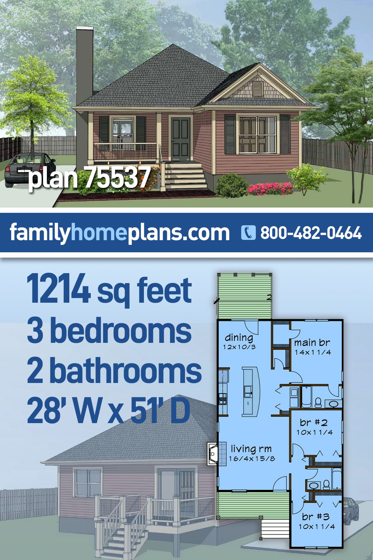 Traditional Style, 1214 Sq Ft, 3 Bed, 2 Bath | Plan 75537