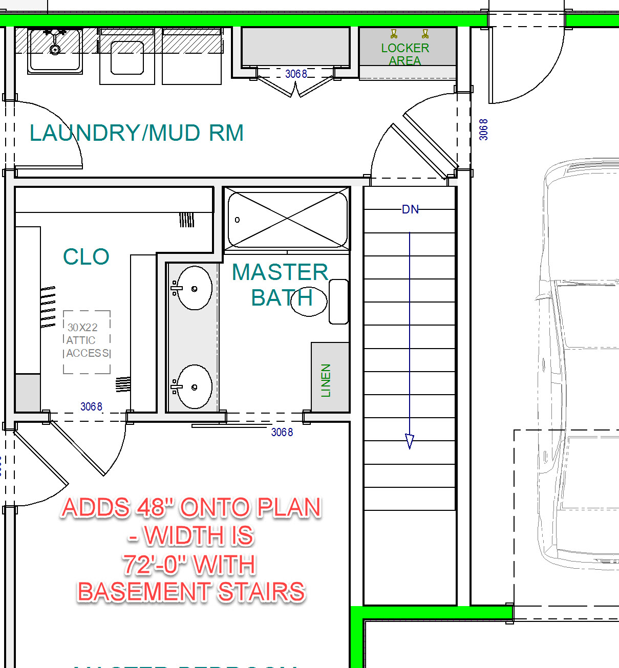 Q:Wondering about basement access? Flip flop the design? I'm guessing that's the heater by the laundry room. Which the furnace and water heater would be in the basement. So can that wall eliminated?