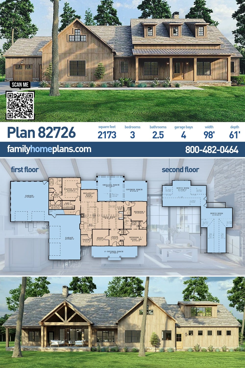 Craftsman Farmhouse Style House Plan 82726 with 2,173 Sq Ft, 3 Bed, 2.5 Bath, 4 Car Garage