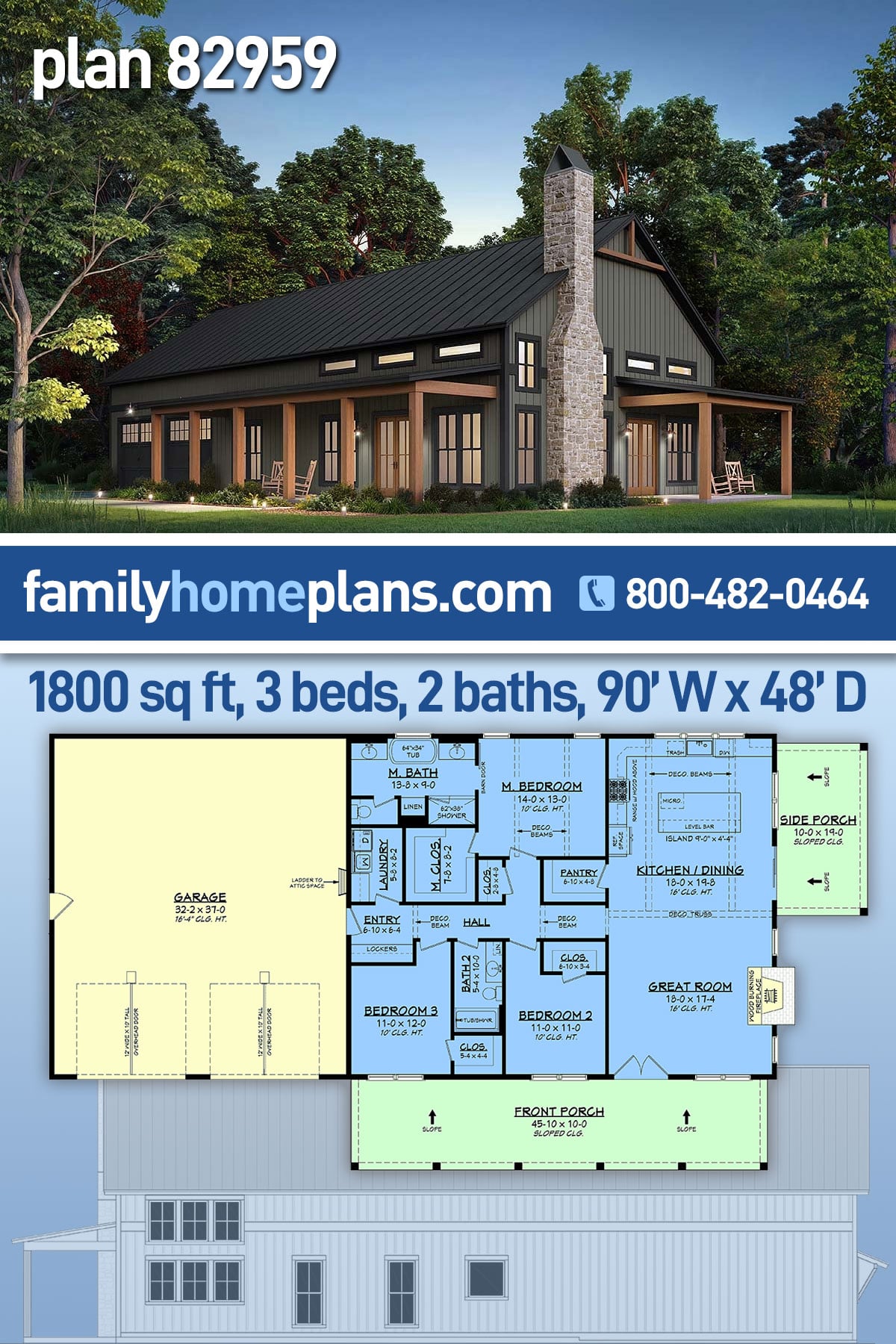This Barndominium design offers fantastic spaces perfect for entertaining, featuring three bedrooms, each with walk-in closets. The open-concept great room, dining area, and kitchen showcase 16' ceilings and are complemented by porches on each side, expansive windows, and a wood burning fireplace. The kitchen is equipped with a large eat-in island and a spacious walk-in pantry. The oversized garage provides ample space and includes access to extra storage above the main living area.