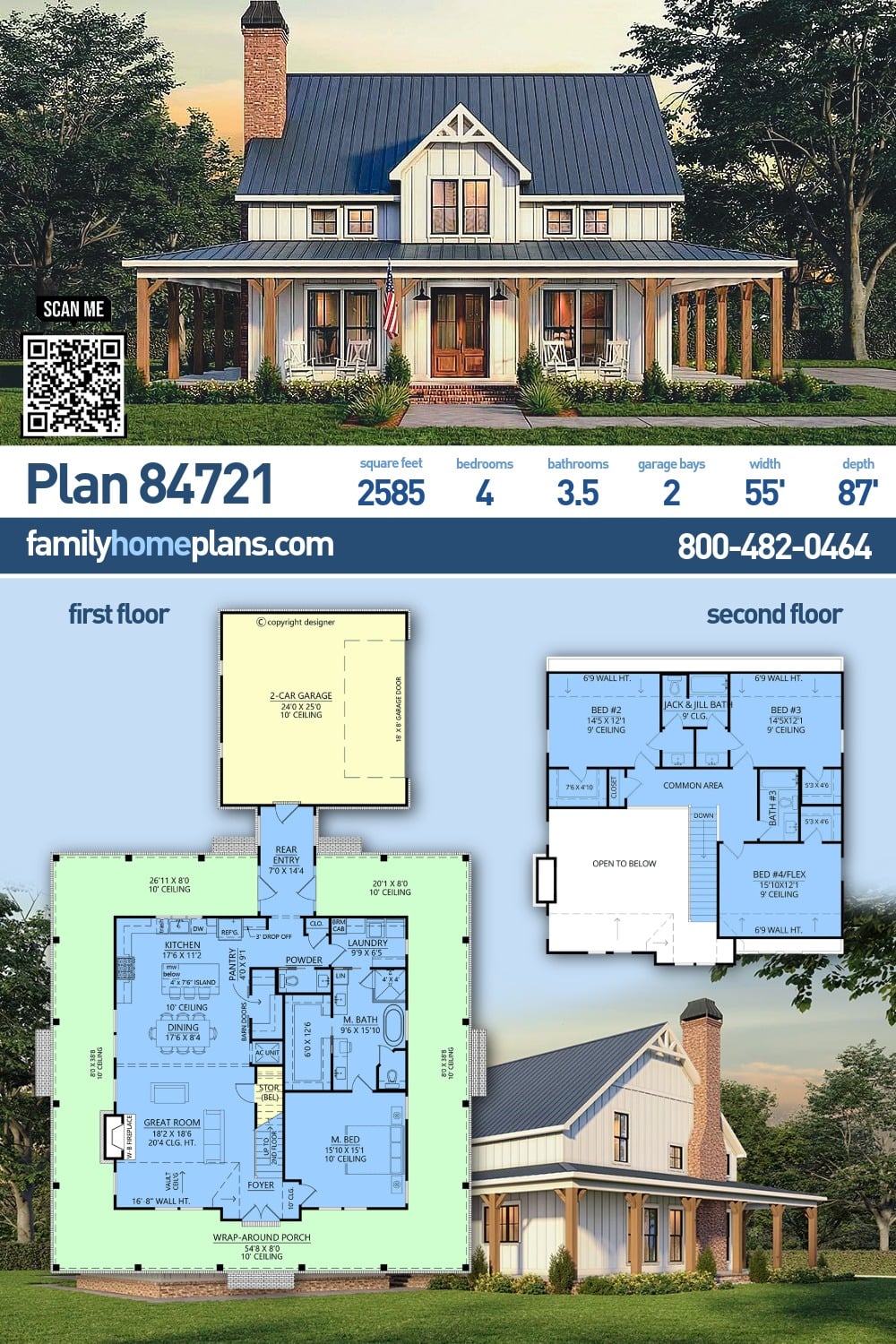 Contemporary, Country, Farmhouse Style House Plan 84721 with 2585 Sq Ft, 4 Bed, 4 Bath, 2 Car Garage